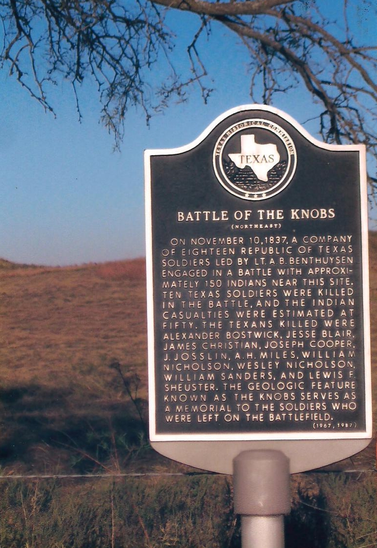 On November 10, 1837, a company of eighteen Republic of Texas soldiers led by Lt. A. B. Benthuysen engaged in a battle with approximately 150 Indians near this site. Ten Texas soldiers were killed in the battle, and the Indian casualties were estimated at fifty. The Texans killed were Alexander Bostwick, Jesse Blair, James Christian, Joseph Cooper, J. Josslin, A. H. Miles, William Nicholson, Wesley Nicholson, William Sanders, and Lewis F. Sheuster. The geologic feature known as the Knobs serves as a memorial to the soldiers who were left on the battlefield.