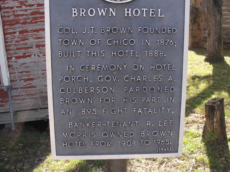 Colonel J.T. Brown founded the town of Chico in 1876; then built this hotel 1888. In a ceremony on the hotel porch, Governor Charles A. Culberson pardoned Brown for his part in an 1895 fight fatality. Banker-tenant R. Lee Morris owned Brown Hotel from 1908 to 1965.